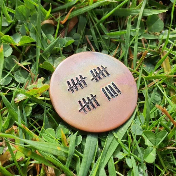 Handmade Hand stampedĀ bronze golf ball marker with a 19 Years Tally Mark.